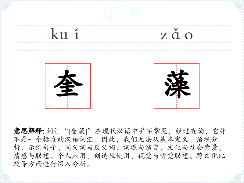 词汇“[奎藻]”在现代汉语中并不常见,经过查询,它并不是一个标准的汉语词汇。因此,我们无法从基本定义、语境分析、示例句子、同义词与反义词、词源与演变、文化与社会背景、情感与联想、个人应用、创造性使用、视觉与听觉联想、跨文化比较等方面进行深入分析。
