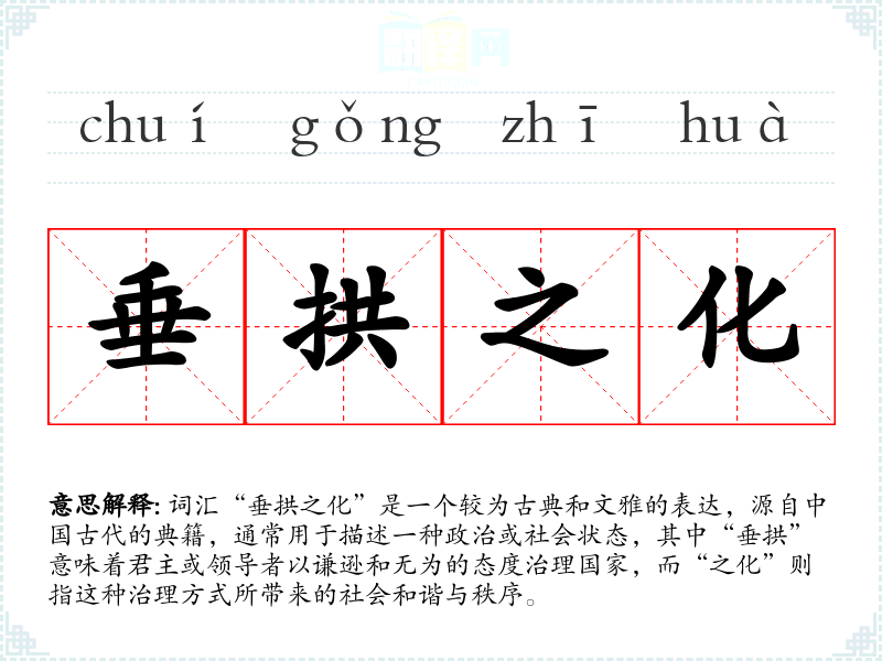 词汇“垂拱之化”是一个较为古典和文雅的表达,源自中国古代的典籍,通常用于描述一种政治或社会状态,其中“垂拱”意味着君主或领导者以谦逊和无为的态度治理国家,而“之化”则指这种治理方式所带来的社会和谐与秩序。