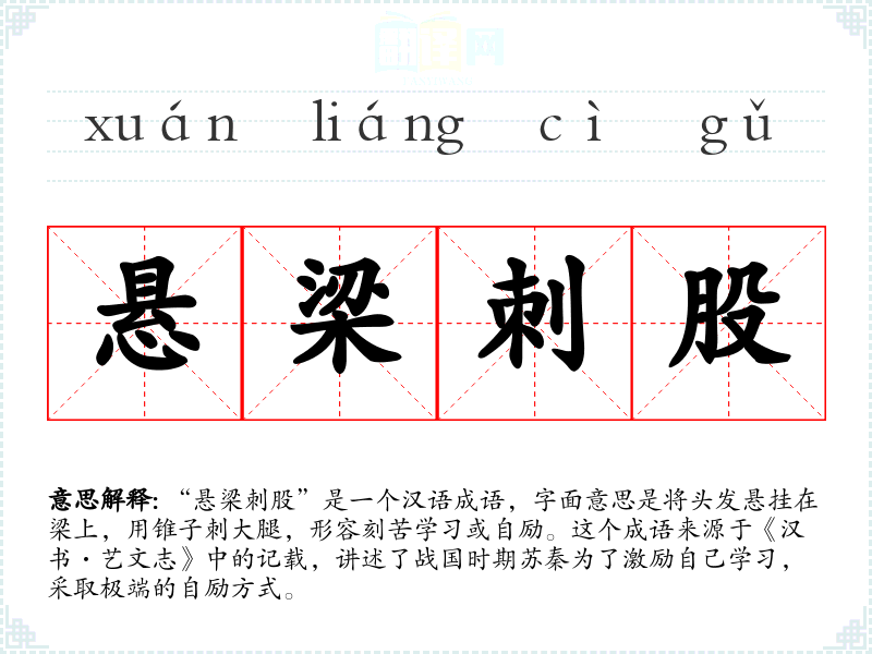 “悬梁刺股”是一个汉语成语,字面意思是将头发悬挂在梁上,用锥子刺大腿,形容刻苦学或自励。这个成语来源于《汉书·艺文志》中的记载,讲述了战国时期苏秦为了激励自己学,采取极端的自励方式。