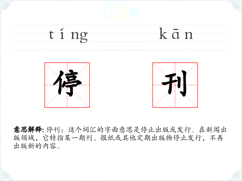 “停刊”一词源于中文,由“停”和“刊”两个字组成。在古代,“刊”指的是刻版印刷,后来泛指出版。随着现代出版业的发展,“停刊”成为了一个专业术语,用来描述出版物的停止发行。