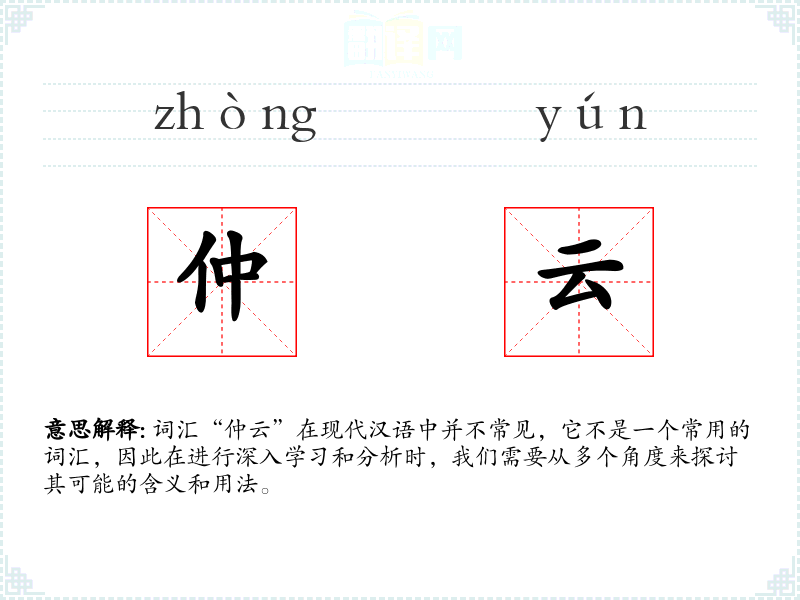 词汇“仲云”在现代汉语中并不常见,它不是一个常用的词汇,因此在进行深入学*和分析时,我们需要从多个角度来探讨其可能的含义和用法。