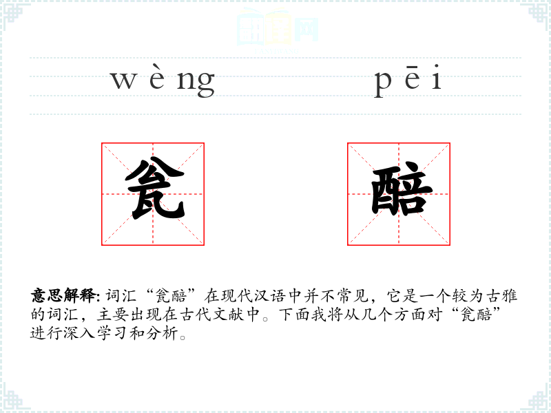 词汇“瓮醅”在现代汉语中并不常见,它是一个较为古雅的词汇,主要出现在古代文献中。下面我将从几个方面对“瓮醅”进行深入学*和分析。