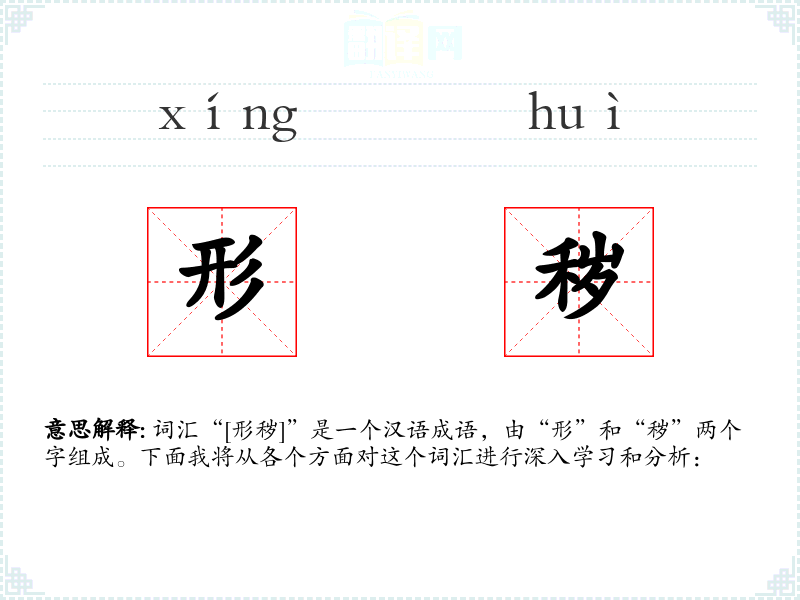 词汇“[形秽]”是一个汉语成语,由“形”和“秽”两个字组成。下面我将从各个方面对这个词汇进行深入学*和分析: