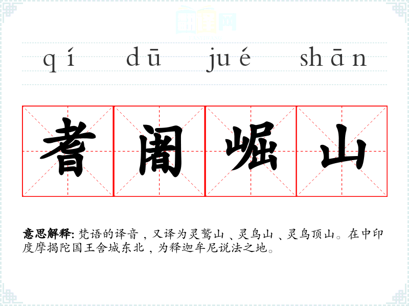 梵语的译音﹐又译为灵鹫山﹑灵鸟山﹑灵鸟顶山。在中印度摩揭陀国王舍城东北﹐为释迦牟尼说法之地。
