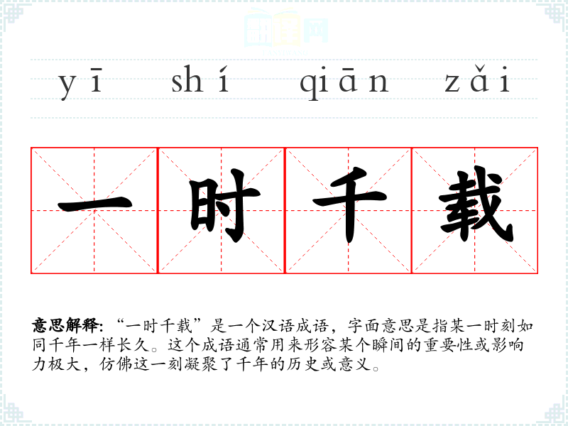 同义词“千载难逢”强调的罕见和重要性,而“一时千载”更侧重于瞬间的深远影响。反义词“平凡无奇”和“转瞬即逝”则分别强调的普通性和短暂性。