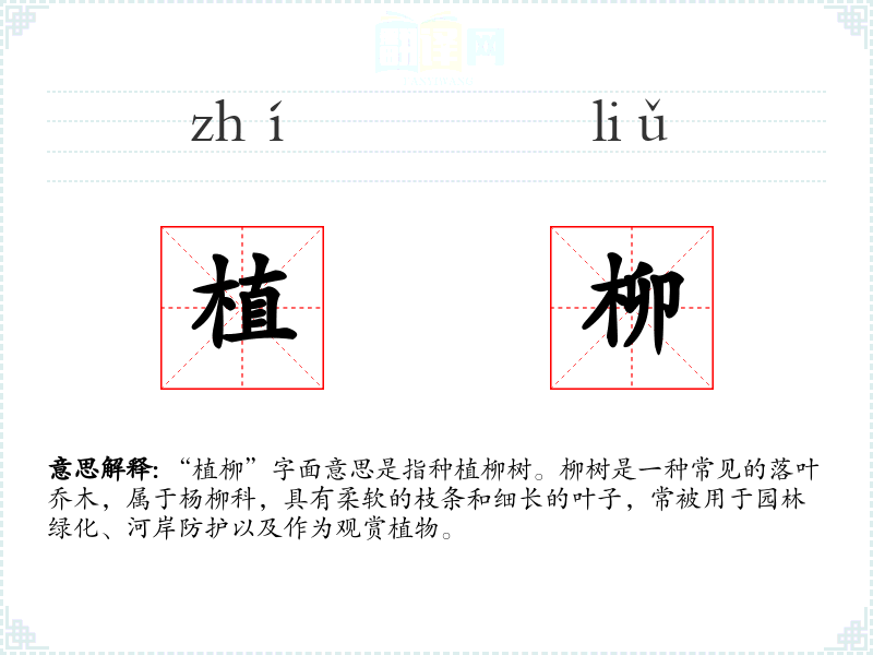 同义词:种柳、栽柳 反义词:伐柳(砍伐柳树)