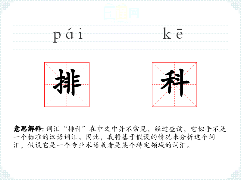 词汇“排科”在中文中并不常见,经过查询,它似乎不是一个标准的汉语词汇。因此,我将基于假设的情况来分析这个词汇,假设它是一个专业术语或者是某个特定领域的词汇。