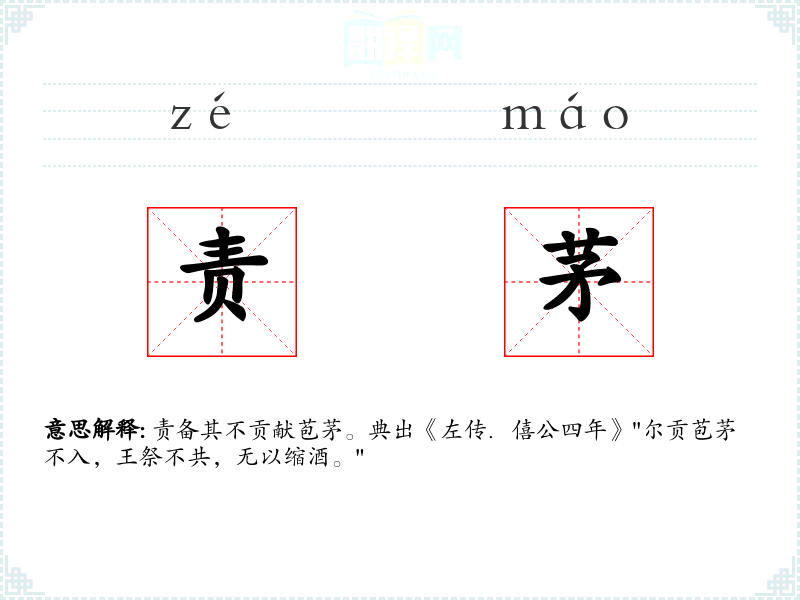责备其不贡献苞茅。典出《左传.僖公四年》"尔贡苞茅不入,王祭不共,无以缩酒。"