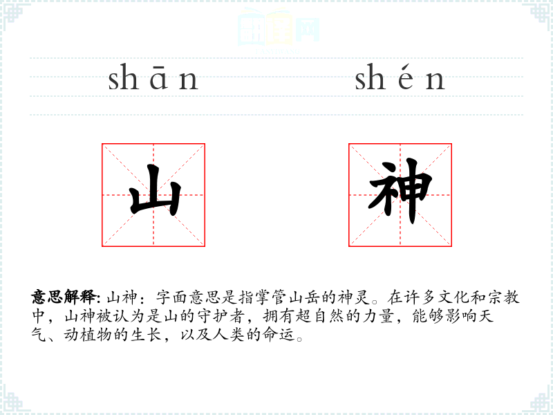 - 反义词:无(因为山神是特定概念,没有直接的反义词)