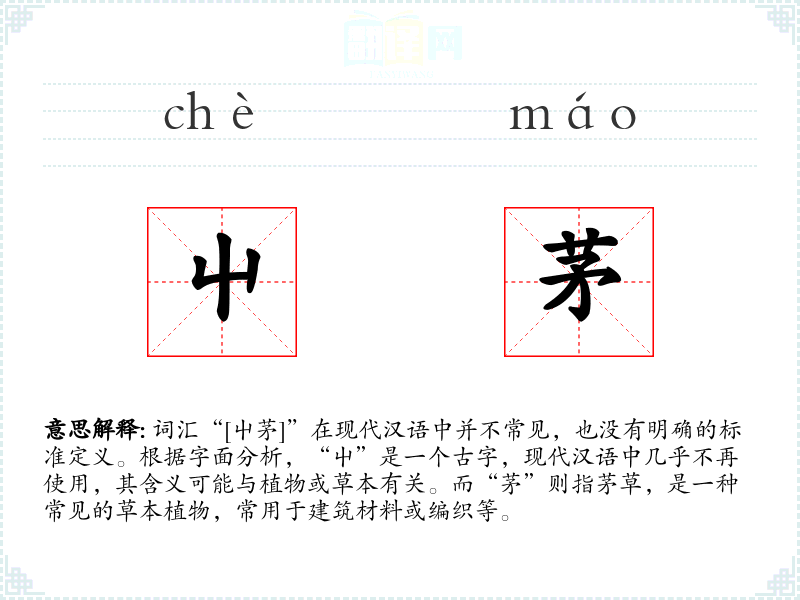 词汇“[屮茅]”在现代汉语中并不常见,也没有明确的标准定义。根据字面分析,“屮”是一个古字,现代汉语中几乎不再使用,其含义可能与植物或草本有关。而“茅”则指茅草,是一种常见的草本植物,常用于建筑材料或编织等。