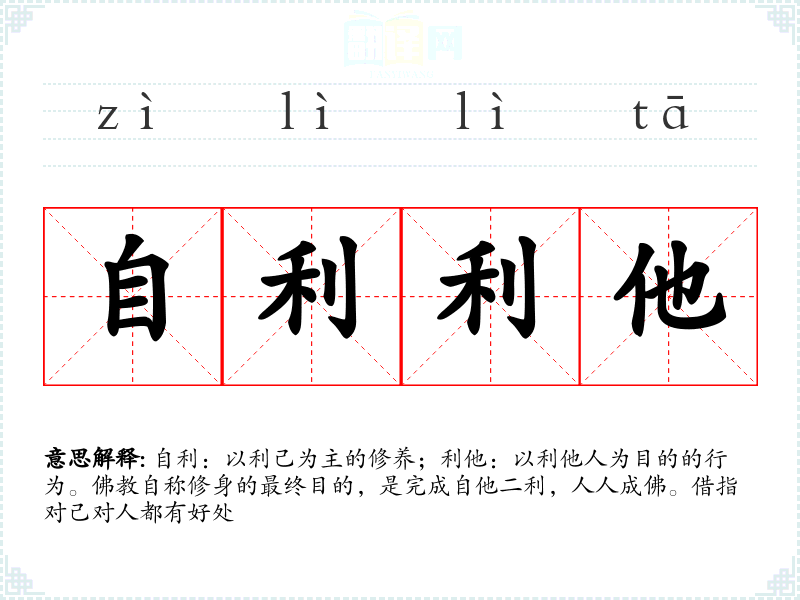 自利:以利己为主的修养;利他:以利他人为目的的行为。佛教自称修身的最终目的,是完成自他二利,人人成佛。借指对己对人都有好处