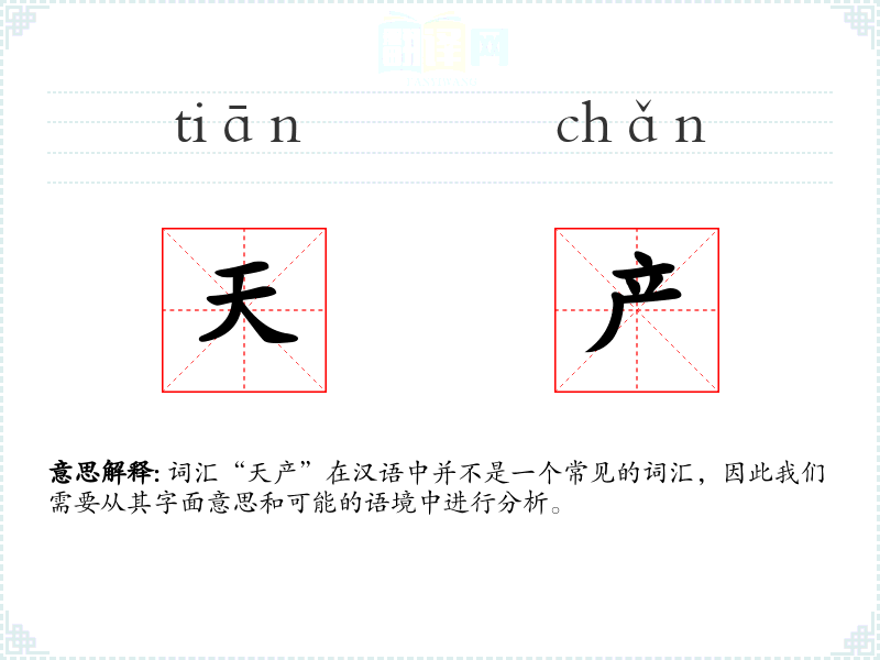 词汇“天产”在汉语中并不是一个常见的词汇,因此我们需要从其字面意思和可能的语境中进行分析。