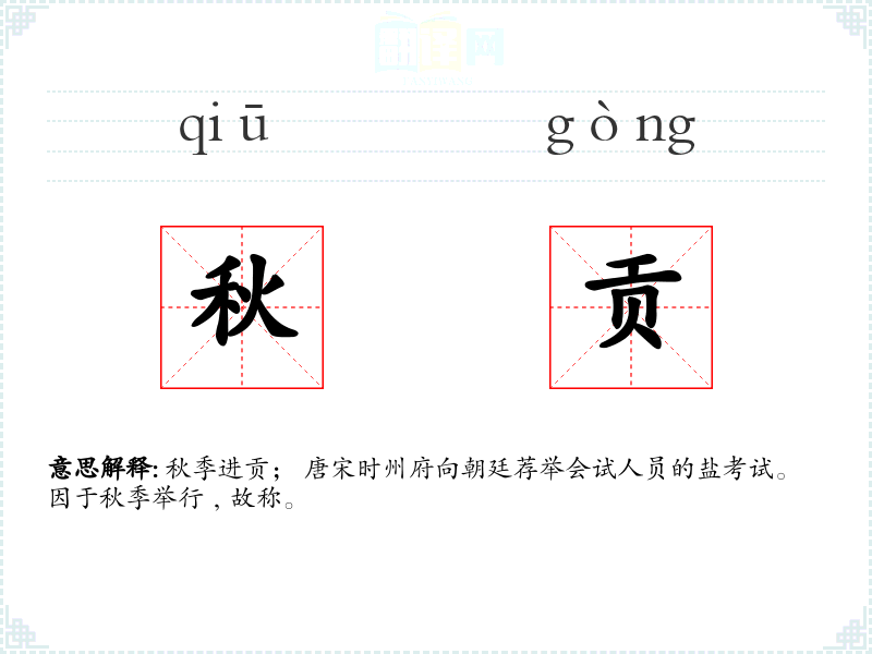 秋季进贡; 唐宋时州府向朝廷荐举会试人员的盐考试。因于秋季举行﹐故称。
