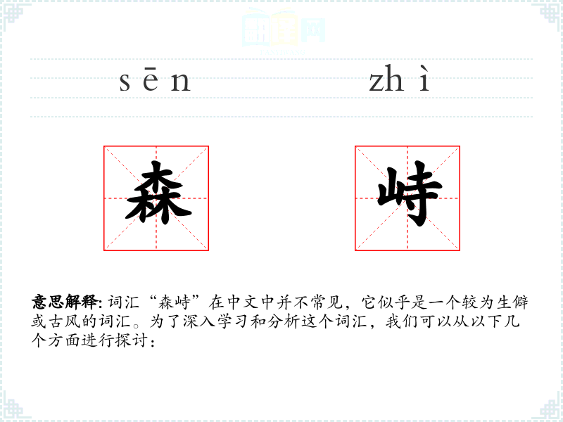 词汇“森峙”在中文中并不常见,它似乎是一个较为生僻或古风的词汇。为了深入学*和分析这个词汇,我们可以从以下几个方面进行探讨: