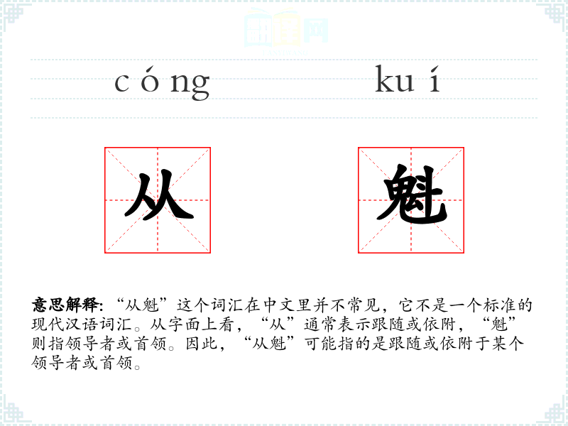 “从魁”这个词汇在中文里并不常见,它不是一个标准的现代汉语词汇。从字面上看,“从”通常表示跟随或依附,“魁”则指领导者或首领。因此,“从魁”可能指的是跟随或依附于某个领导者或首领。