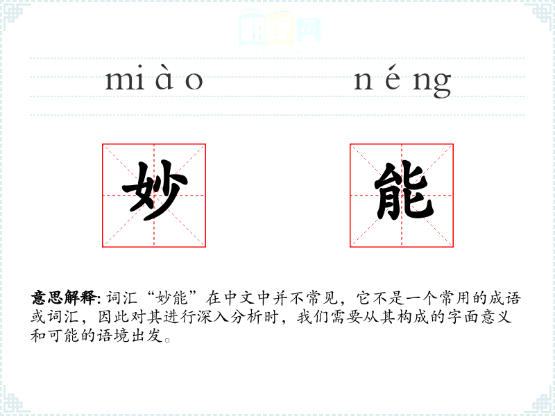词汇“妙能”在中文中并不常见,它不是一个常用的成语或词汇,因此对其进行深入分析时,我们需要从其构成的字面意义和可能的语境出发。