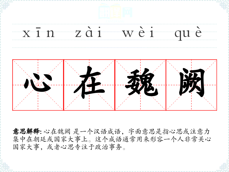 心在魏阙 是一个汉语成语,字面意思是指心思或注意力集中在朝廷或国家大事上。这个成语通常用来形容一个人非常关心国家大事,或者心思专注于政治事务。