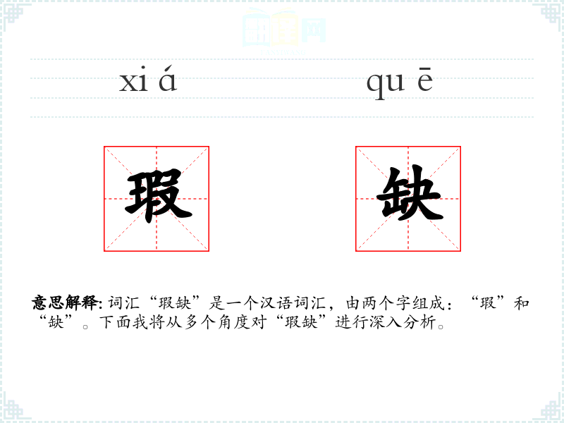 “瑕缺”字面意思是指玉石上的瑕疵和缺陷。在更广泛的意义上,它用来形容事物的不完美之处,特别是指那些明显的缺点或不足。
