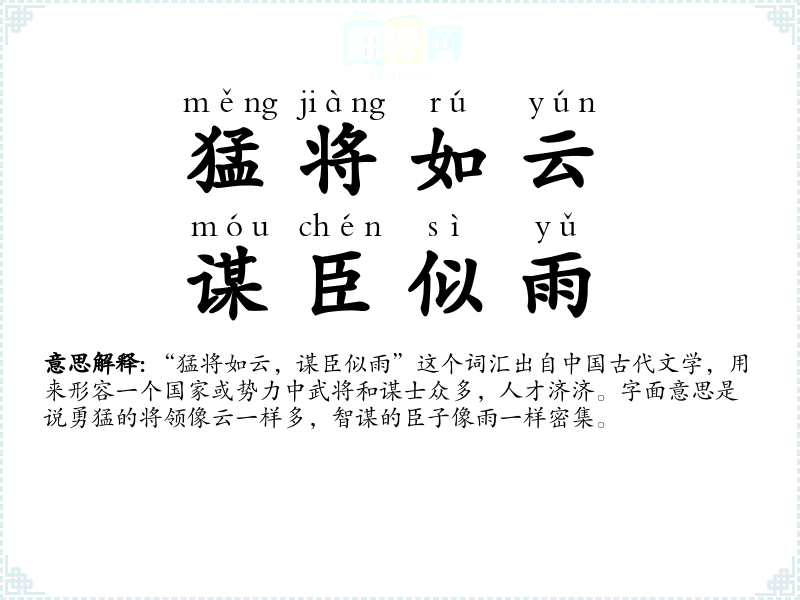 “猛将如云,谋臣似雨”这个词汇出自**古代文学,用来形容一个国家或势力中武将和谋士众多,人才济济。字面意思是说勇猛的将领像云一样多,智谋的臣子像雨一样密集。