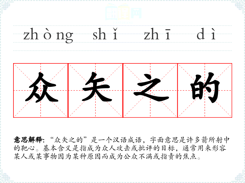 “众矢之的”是一个汉语成语,字面意思是许多箭所射中的靶心。基本含义是指成为众人攻击或批评的目标,通常用来形容某人或某事物因为某种原因而成为公众不满或指责的焦点。