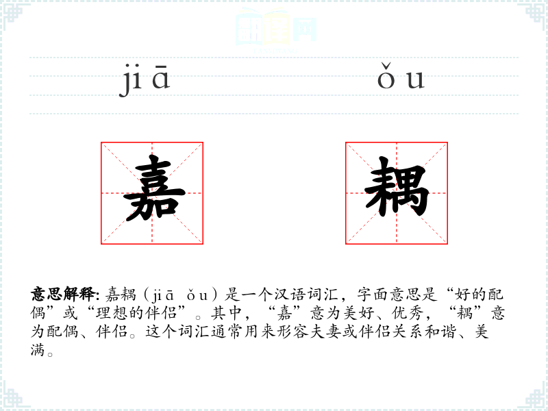 嘉耦(jiā ǒu)是一个汉语词汇,字面意思是“好的配偶”或“理想的伴侣”。其中,“嘉”意为美好、优秀,“耦”意为配偶、伴侣。这个词汇通常用来形容夫妻或伴侣关系和谐、美满。