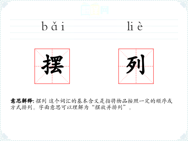 摆列 这个词汇的基本含义是指将物品按照一定的顺序或方式排列。字面意思可以理解为“摆放并排列”。