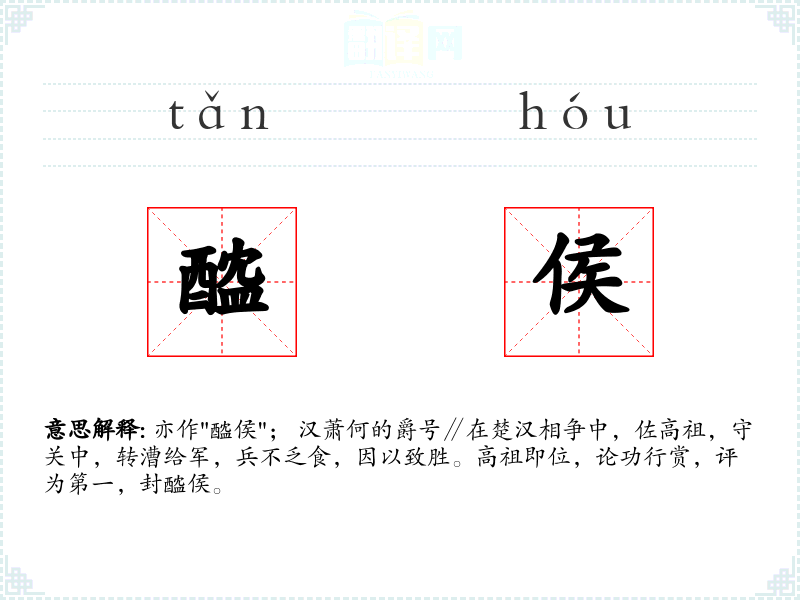 亦作"醓侯"; 汉萧何的爵号∥在楚汉相争中,佐高祖,守关中,转漕给军,兵不乏食,因以致胜。高祖即位,
