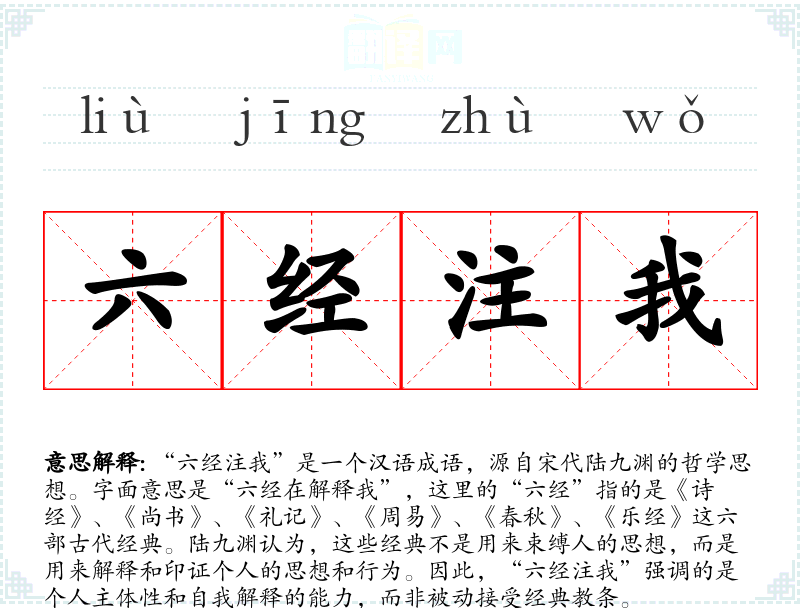 “六经注我”是一个汉语成语,源自宋代陆九渊的哲学思想。字面意思是“六经在解释我”,这里的“六经”指的是《诗经》、《尚书》、《礼记》、《周易》、《春秋》、《乐经》这六部古代经典。陆九渊认为,这些经典不是用来束缚人的思想,而是用来解释和印证个人的思想和行为。因此,“六经注我”强调的是个人主体性和自我解释的能力,而非被动接受经典教条。