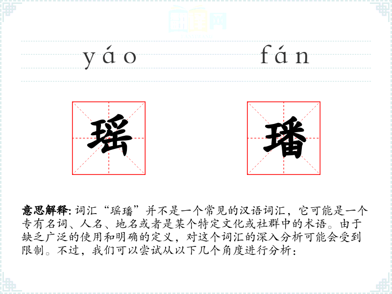 由于“瑶璠”不是一个标准词汇,我们无法提供一个确切的基本定义。它可能是由两个字组合而成的,其中“瑶”通常与美玉或美好的事物相关联,而“璠”则较少见,可能是一个姓氏或特定文化中的词汇。