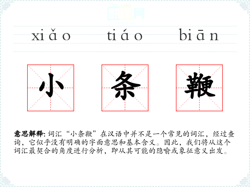 由于“小条鞭”不是一个标准词汇,我们无法提供一个确切的基本定义。它可能是某个方言词汇,或者是某个特定行业或社群中的术语。