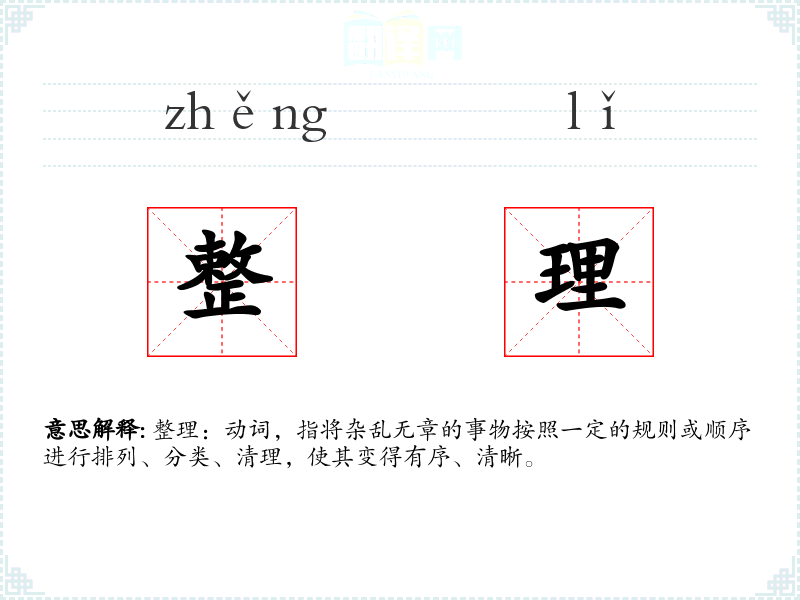 整理:动词,指将杂乱无章的事物按照一定的规则或顺序进行排列、分类、清理,使其变得有序、清晰。