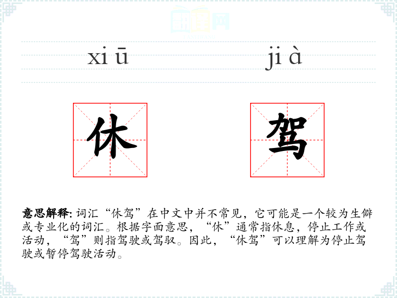 词汇“休驾”在中文中并不常见,它可能是一个较为生僻或专业化的词汇。根据字面意思,“休”通常指休息,停止工作或活动,“驾”则指驾驶或驾驭。因此,“休驾”可以理解为停止驾驶或暂停驾驶活动。