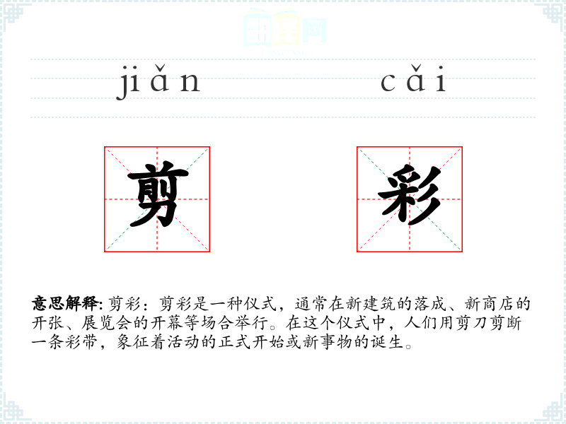 剪彩作为一个词汇,不仅代表了具体的仪式行为,也承载了人们对新开始的期待和庆祝的情感。在语言学*和表达中,理解和运用这一词汇有助于丰富我们的词汇量和表达能力。