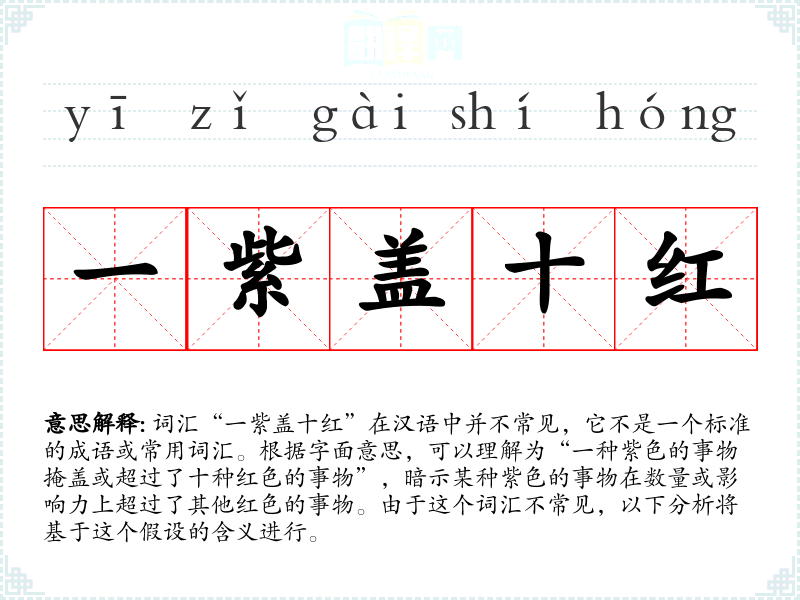 由于“一紫盖十红”不是一个标准的成语或常用词汇,其词源和演变不详。这个表达可能是现代创造的,用于特定的比喻或描述。