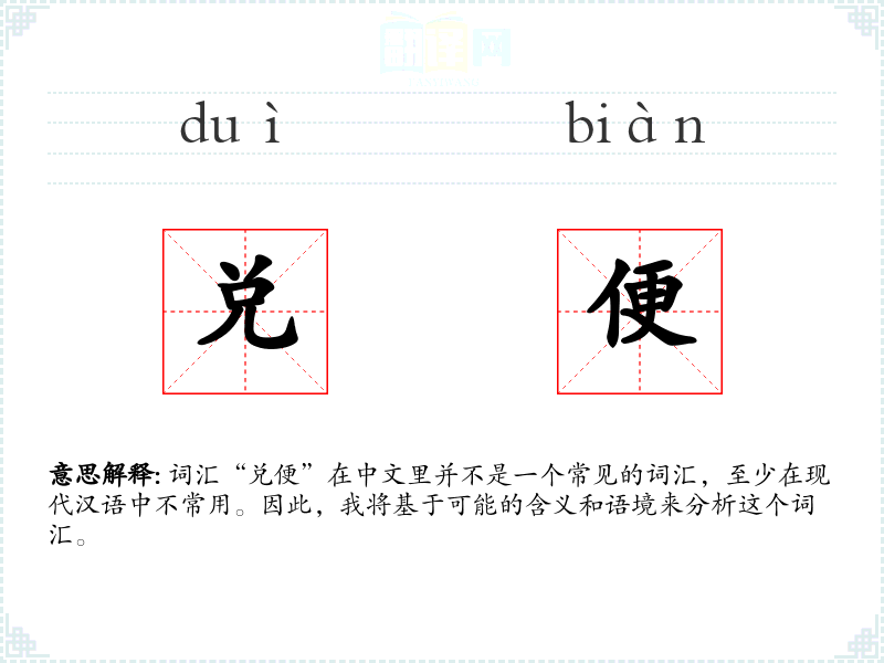 词汇“兑便”在中文里并不是一个常见的词汇,至少在现代汉语中不常用。因此,我将基于可能的含义和语境来分析这个词汇。