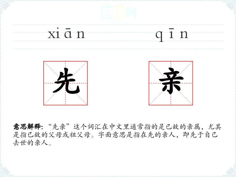 “先亲”这个词汇在中文里通常指的是已故的亲属,尤其是指已故的父母或祖父母。字面意思是指在先的亲人,即先于自己去世的亲人。