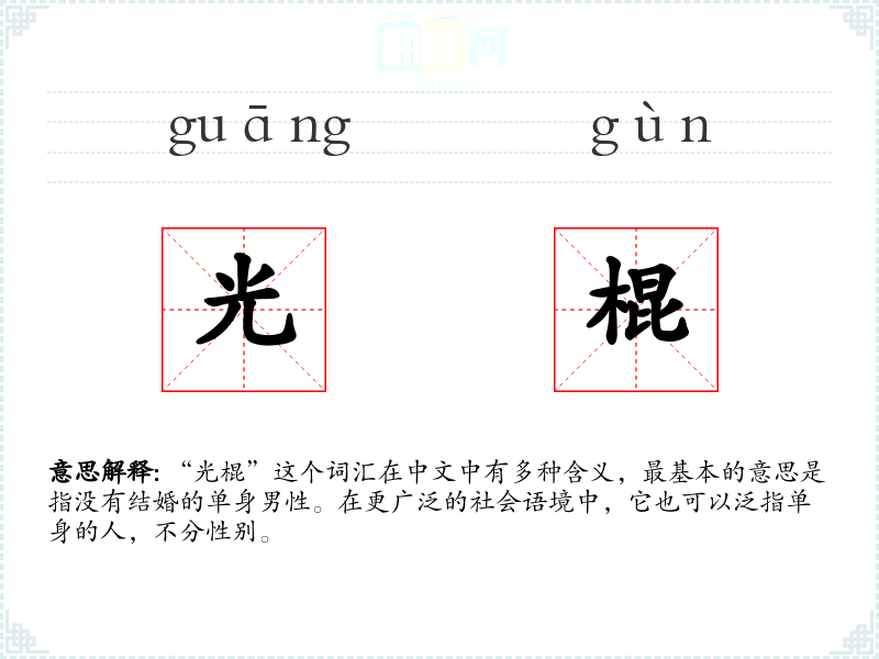 “光棍”这个词汇在中文中有多种含义,最基本的意思是指没有结婚的单身男性。在更广泛的社会语境中,它也可以泛指单身的人,不分性别。