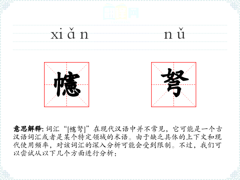 词汇“[幰弩]”在现代汉语中并不常见,它可能是一个古汉语词汇或者是某个特定领域的术语。由于缺乏具体的上下文和现代使用频率,对该词汇的深入分析可能会受到限制。不过,我们可以尝试从以下几个方面进行分析: