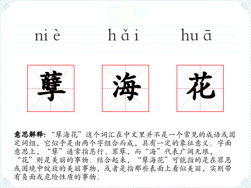 “孽海花”这个词汇虽然不常见,但它提供了一个丰富的象征空间,可以用来表达在困难或负面环境中依然能够发现或创造美好的概念。在语言学习和表达中,理解和运用这样的词汇可以增加表达的深度和多样性。