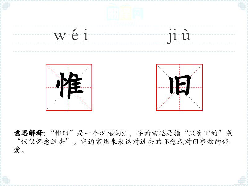 “惟旧”这个词源于古代汉语,其中“惟”有“只有”或“仅仅”的意思,“旧”指“过去的”或“老的”。在古代文献中,这个词常用来表达对过去的执着或怀念。随着时间的推移,其使用范围和语境有所扩展,但基本含义保持不变。