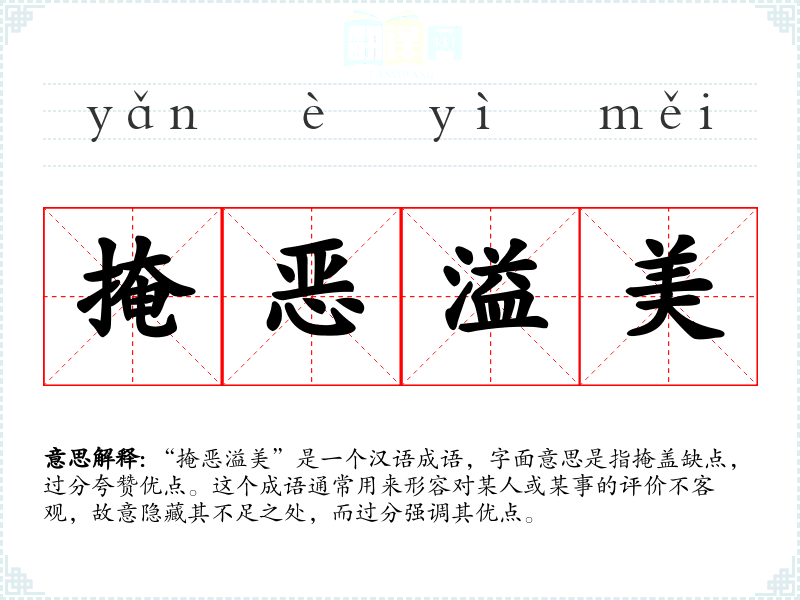 “掩恶溢美”是一个汉语成语,字面意思是指掩盖缺点,过分夸赞优点。这个成语通常用来形容对某人或某事的评价不客观,故意隐藏其不足之处,而过分强调其优点。