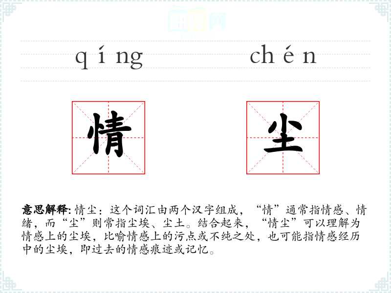 情尘:这个词汇由两个汉字组成,“情”通常指情感、情绪,而“尘”则常指尘埃、尘土。结合起来,“情尘”可以理解为情感上的尘埃,比喻情感上的污点或不纯之处,也可能指情感经历中的尘埃,即过去的情感痕迹或记忆。