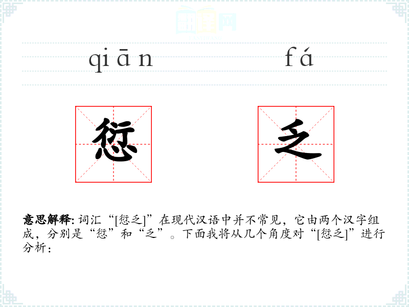 词汇“[愆乏]”在现代汉语中并不常见,它由两个汉字组成,分别是“愆”和“乏”。下面我将从几个角度对“[愆乏]”进行分析: