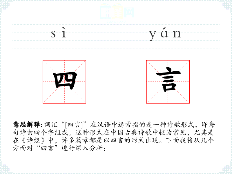 - 专业领域:在文学研究和古典诗歌教学中,“四言”是一个重要的研究对象。