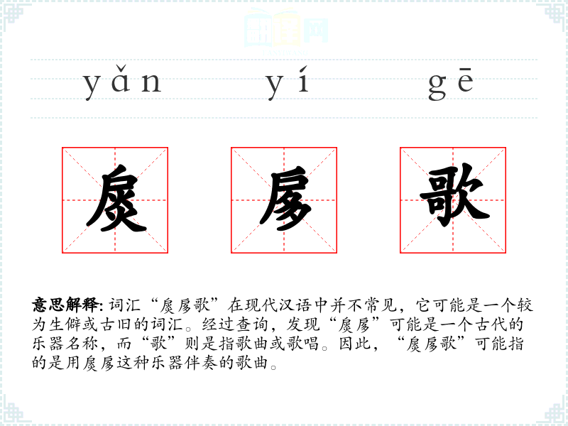 词汇“扊扅歌”在现代汉语中并不常见,它可能是一个较为生僻或古旧的词汇。经过查询,发现“扊扅”可能是一个古代的乐器名称,而“歌”则是指歌曲或歌唱。因此,“扊扅歌”可能指的是用扊扅这种乐器伴奏的歌曲。