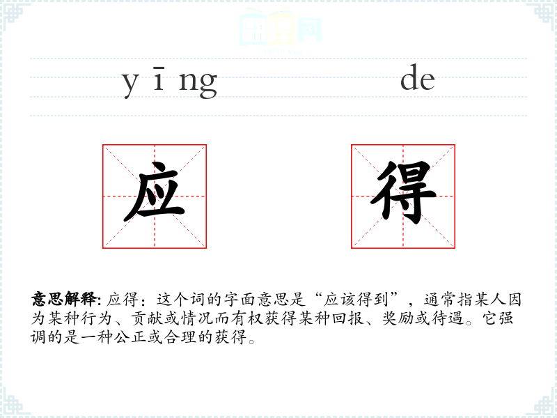 应得:这个词的字面意思是“应该得到”,通常指某人因为某种行为、贡献或情况而有权获得某种回报、奖励或待遇。它强调的是一种公正或合理的获得。