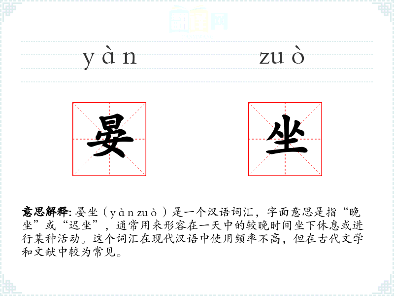 “晏”字在古代汉语中有“晚”、“迟”的意思,而“坐”则是指坐下。因此,“晏坐”合起来就是指在较晚的时间坐下。这个词汇在古代文献中较为常见,但在现代汉语中使用频率较低。