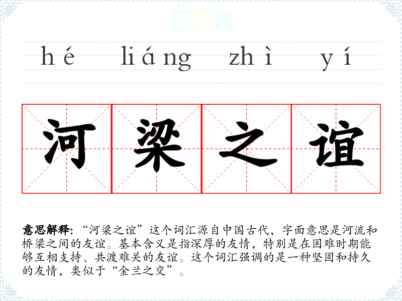 “河梁之谊”这个词汇源自**古代,字面意思是河流和桥梁之间的友谊。基本含义是指深厚的友情,特别是在困难时期能够互相支持、共渡难关的友谊。这个词汇强调的是一种坚固和持久的友情,类似于“金兰之交”。