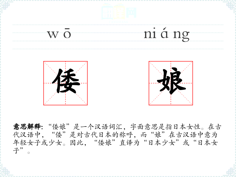 “倭娘”是一个汉语词汇,字面意思是指日本女性。在古代汉语中,“倭”是对古代日本的称呼,而“娘”在古汉语中意为年轻女子或少女。因此,“倭娘”直译为“日本少女”或“日本女子”。