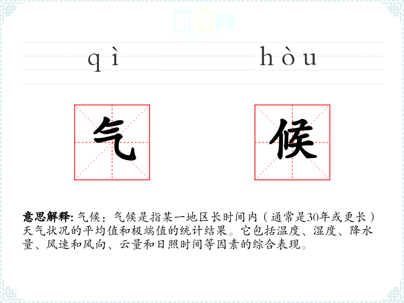 - 反义词:无直接反义词,但可以与“天气”对比,天气指短期内的气象变化。